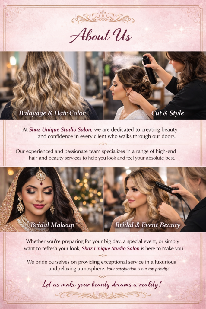 Shaz Unique Studio Salon was founded with one vision — to create a space where beauty, artistry, and confidence come together. We believe every client deserves personalized attention and results tailored specifically to their features, style, and personality.